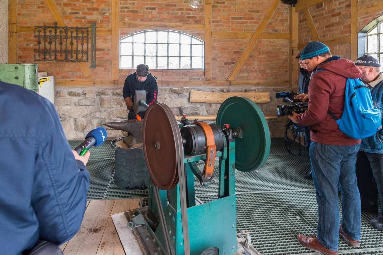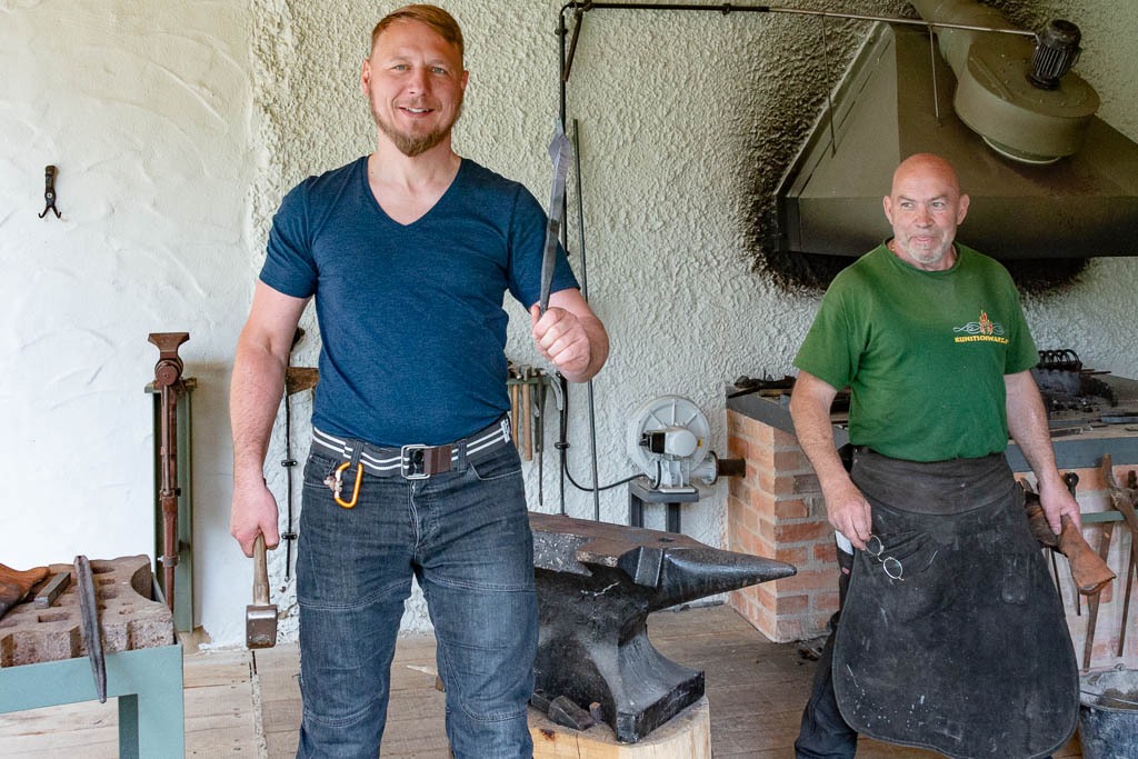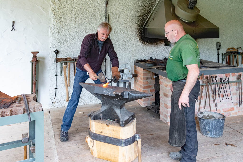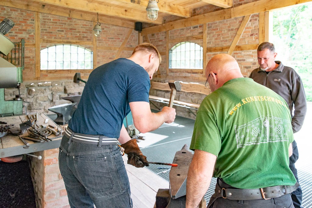 Im Anschluss erläuterte der Schmiedemeister einige Werkzeuge und Techniken des Schmiedehandwerks, ehe die Motorradpiloten selbst zum Hammer griffen, um das Material in Form zu bringen und ihr eigenes Geschick im Umgang mit glühendem Stahl zu beweisen.