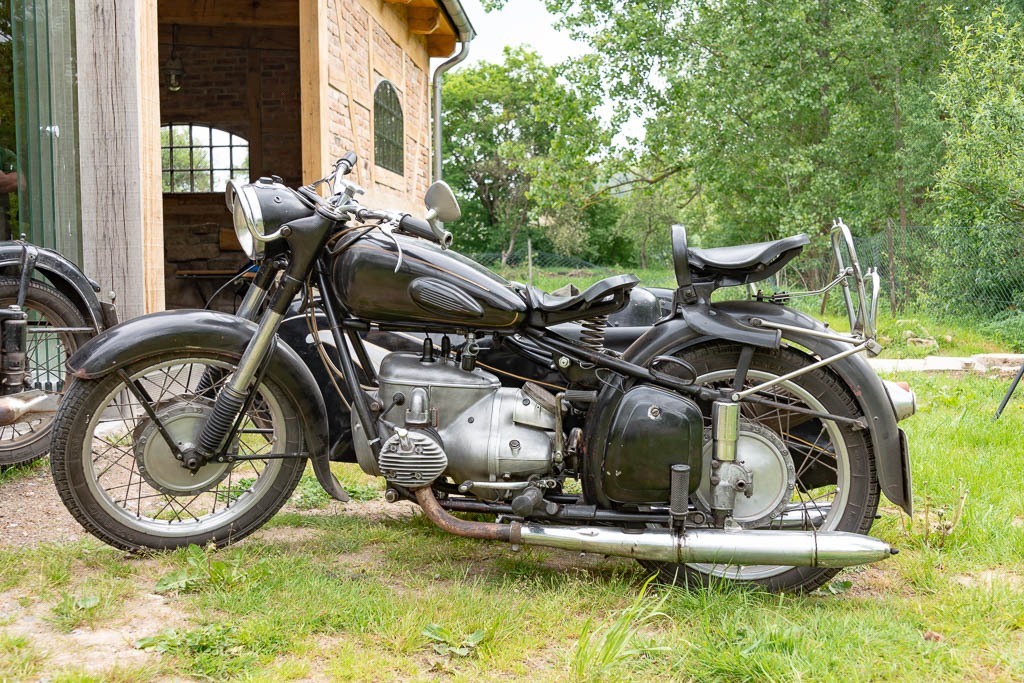 Am Sonnabend kam es in Hetschburg zu einem Treffen der besonderen Art. Fünf Oldtimerfreunde hatte sich mit einer von Simson Suhl gebauten AWO – Baujahr 1954 – damit so jung wie sein Fahrer, einer in den Motorradwerken Zschopau 1957 gebauten BK mit Beiwagen, eine in den Eisenacher Motorenwerken 1953 gebauten EMW und zwei nicht ganz so alten Motorrädern von Suzuki und Harley Davidson zu einer Ausfahrt durch das Thüringer Land getroffen. Für die AWO, deren Tachostand gerade einmal 16.463 km zeigt, war das nach einer Generalinstandsetzung im vergangenem Jahr, bei der der Originalzustand der Maschine erhalten werden konnte, nach Jahrzehnten die erste Fahrt. Mit ihrem 12 PS Viertakt – Einzylindermotor kann man mit beschaulichem Tempo von höchstens 80 km/h die Thüringer Landschaft erleben.
